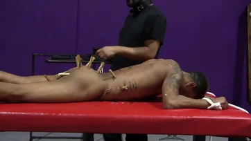Black male slave gets clamped and waxed in dirty BDSM fetish